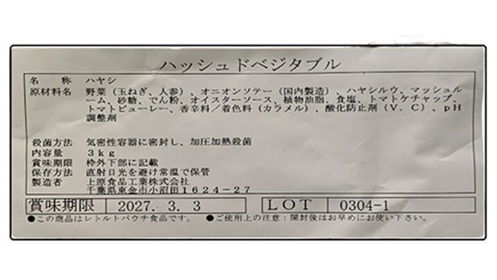 野菜(玉ねぎ、人参)、オニオンソテー(国内製造)、ハヤシルウ、マッシュルーム、砂糖、でん粉、オイスターソース、植物油脂、食塩、トマトケチャップ、トマトピューレー、香辛料/着色料(カラメル)、酸化防止剤(V.C)、pH調整剤