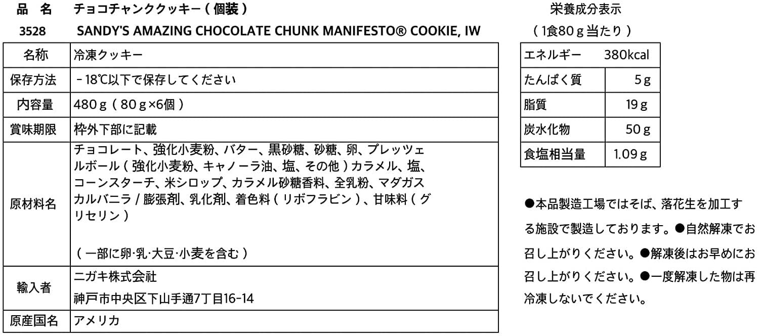 原材料名 : チョコレート、強化小麦粉、バター、黒砂糖、砂糖、卵、プレッツェルボール(強化小麦粉、キャノーラ油、塩、その他)カラメル、塩、コーンスターチ、米シロップ、カラメル砂糖香料、全乳粉、マダガスカルバニラ/膨張剤、乳化剤、着色料(リボフラビン)、甘味料(グリセリン)